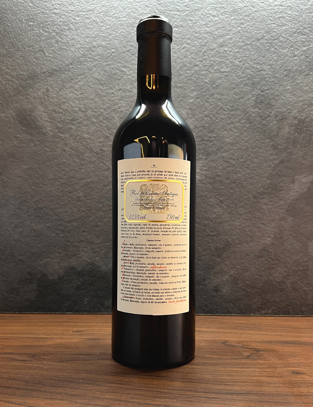 Cor rubi escuro, aroma com notas de fruta madura e madeira em perfeita consonância. Paladar contempla o conjunto das sete castas, demonstrando um carácter consensual e muito gastronómico. Final de prova muito atraente e fino em perfeita harmonia.